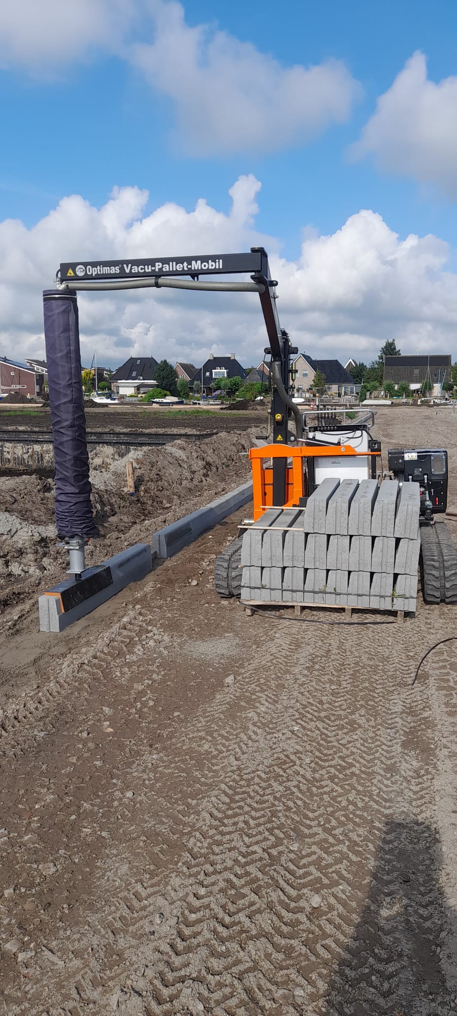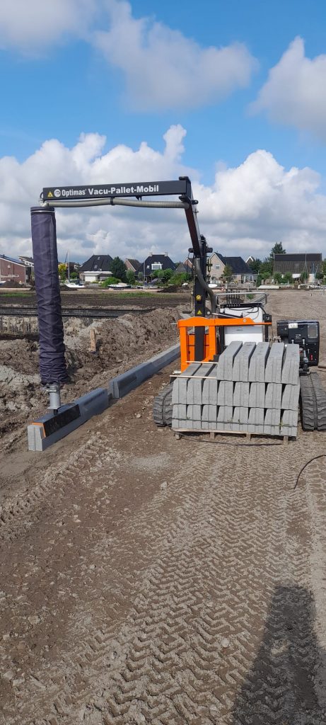 Afgelopen periode zijn we ons meer gaan richten op het plaatsen van opsluitbanden. We hebben geïnvesteerd in een Arbo-vriendelijke machine. Deze machine neemt een pak vol opsluitbanden mee op de lepels. Door middel van een arm met vacuüm kunnen we de banden zonder inspanning optillen en op de juiste plek langs de draad zetten.